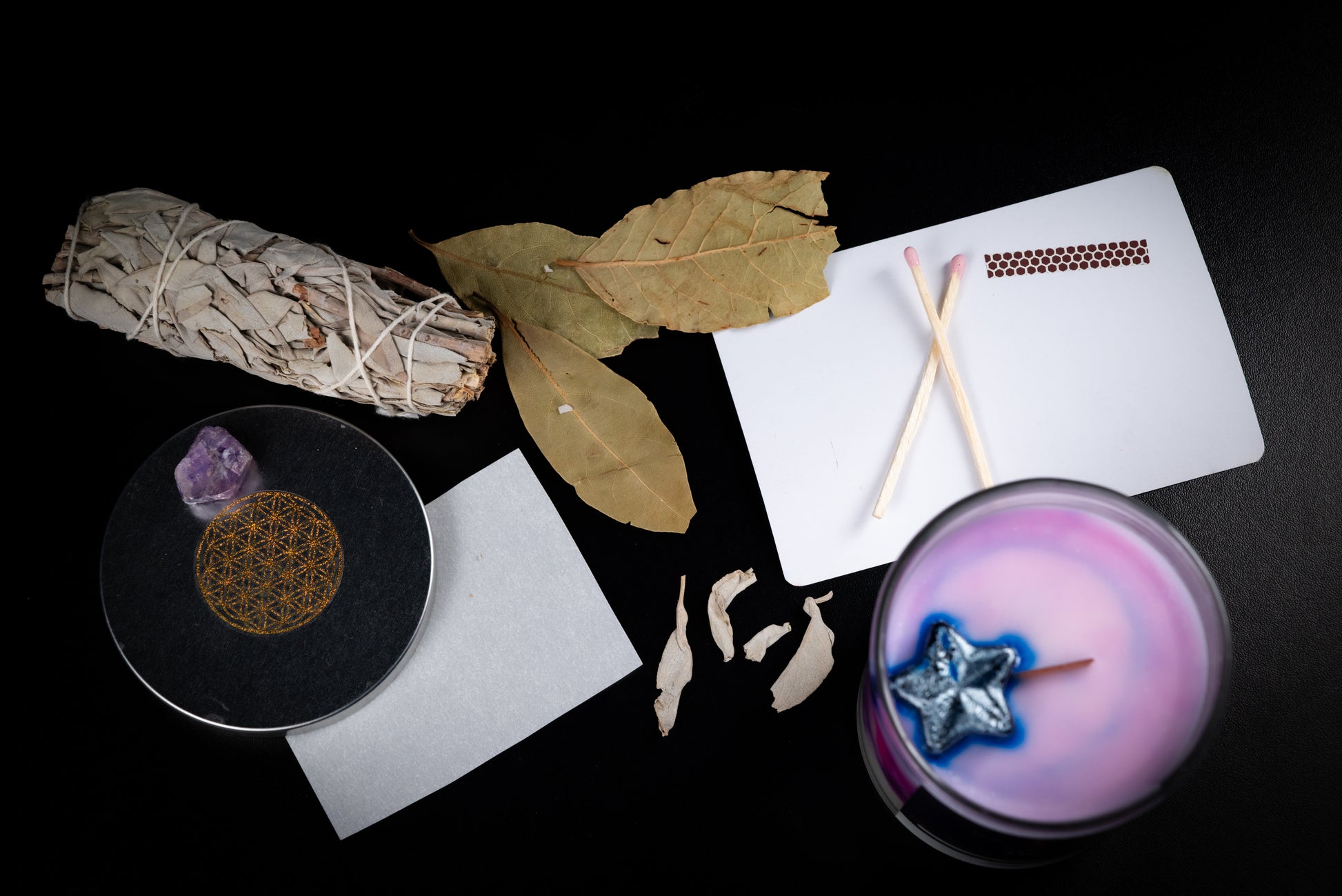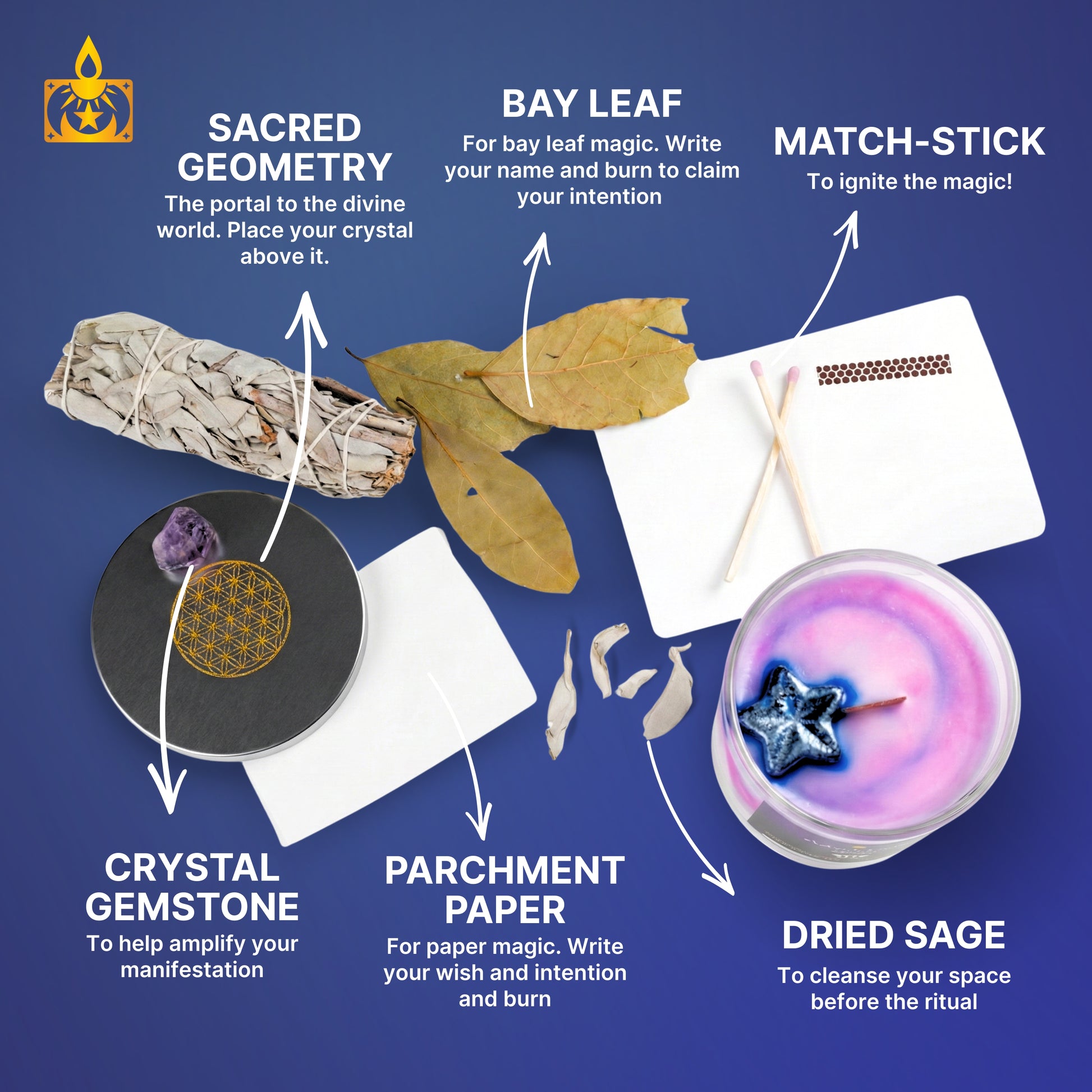 Your candle comes with ritual materials to amplify its energy. The bay leaf supports manifestation through bay leaf magic by writing your name and burning it. The parchment paper is for paper magic used in ancient traditions to write your wish and send it into the universe. The sage pieces cleanse your space and call your spirit guides before you begin.