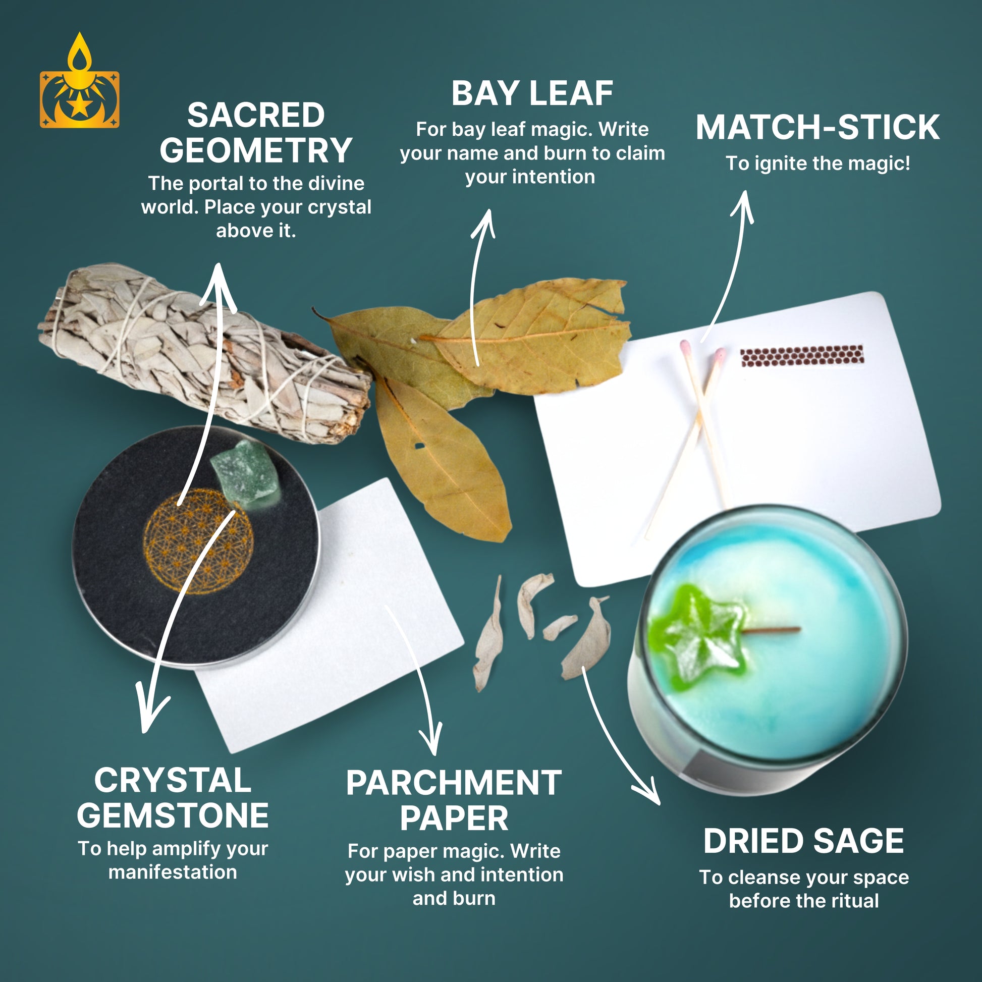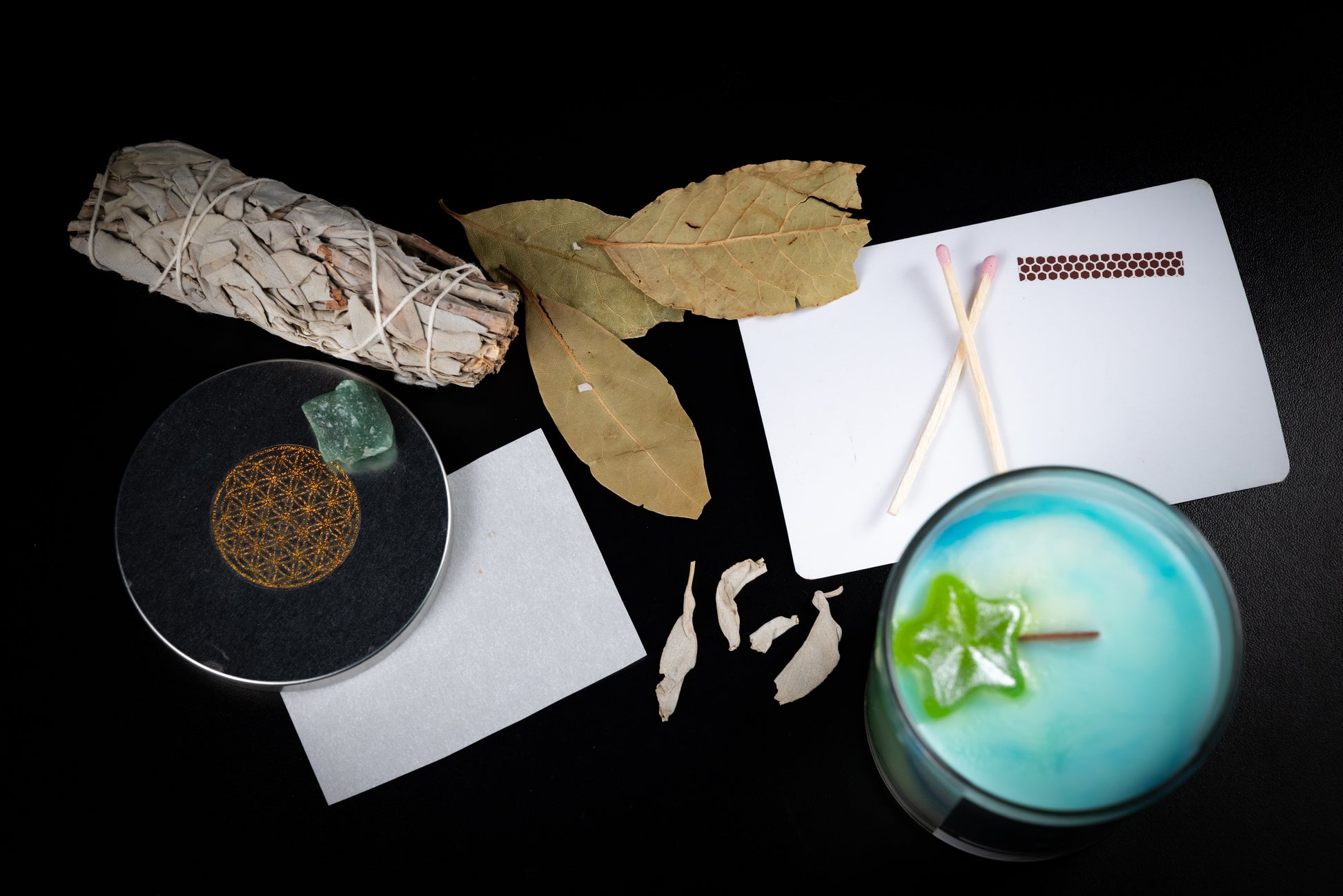 Your candle comes with ritual materials to amplify its energy. The bay leaf supports manifestation through bay leaf magic by writing your name and burning it. The parchment paper is for paper magic practiced across ancient traditions to write your wish and send it into the universe. The sage pieces cleanse your space and call your spirit guides before you begin.